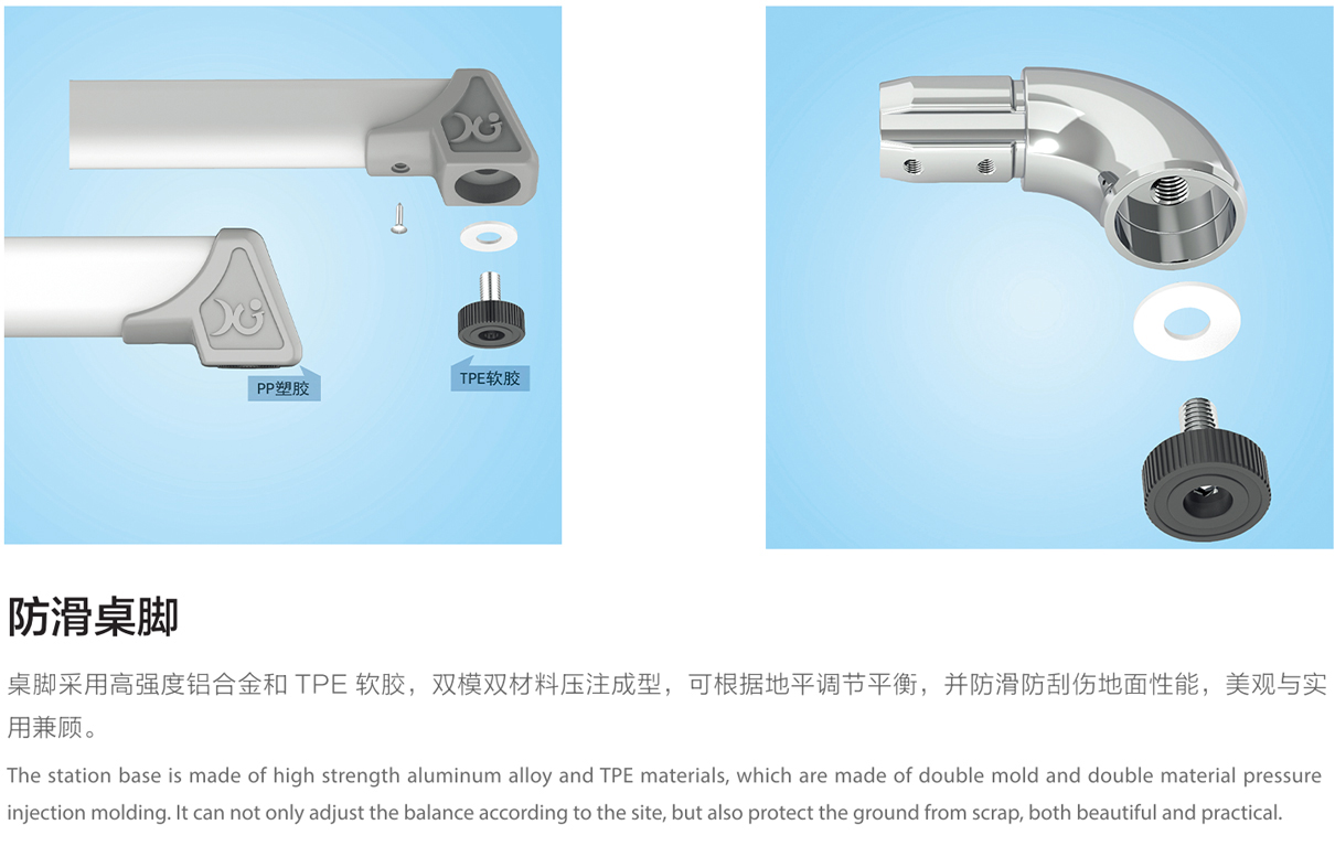 5.桌脚掌:1.5mm壁厚,脚套底有4个平衡调节机构。